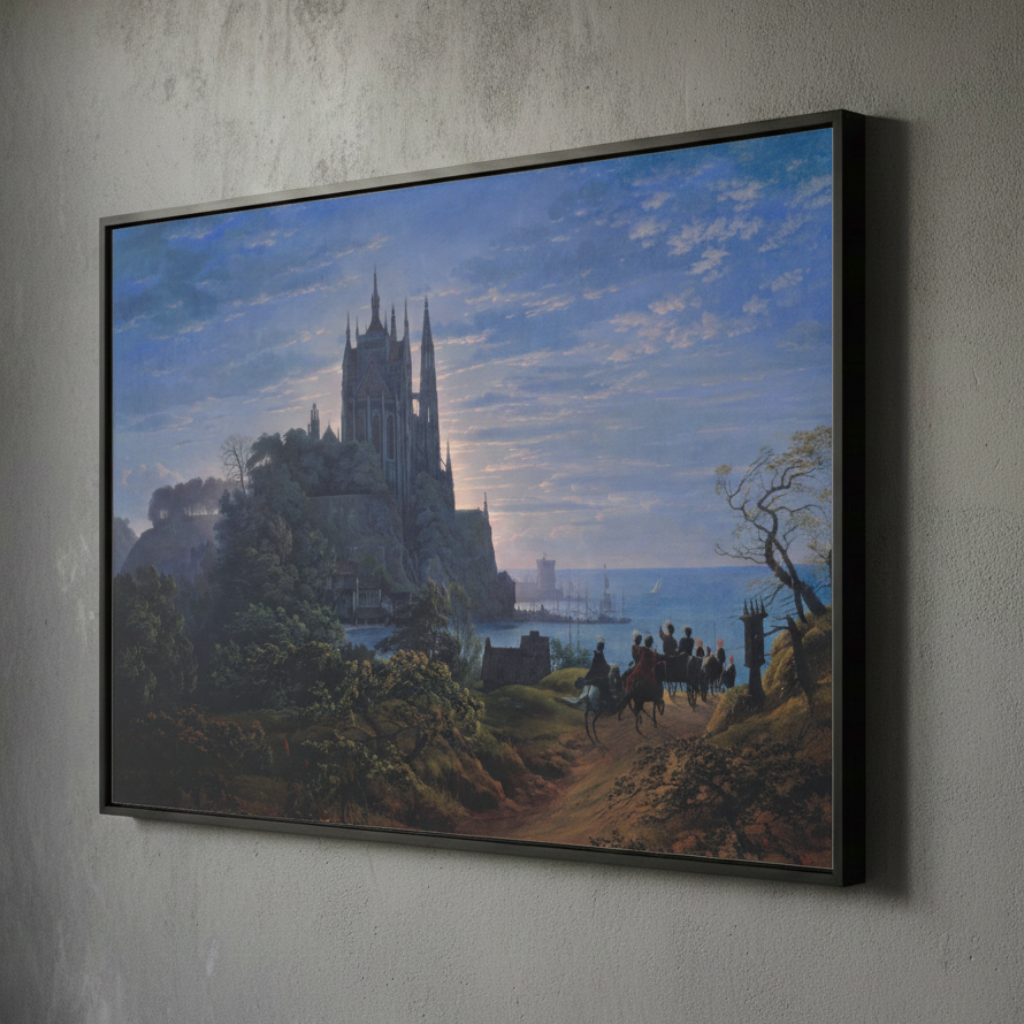 Painted during the rise of German Romanticism, Gothic Church on a Rock by the Sea presents architecture as a stabilizing force set against the vastness of nature. Karl Friedrich Schinkel places a monumental Gothic cathedral atop a rocky promontory, elevated above land and sea alike. The structure does not blend into its surroundings—it asserts itself, establishing order through height, symmetry, and permanence.